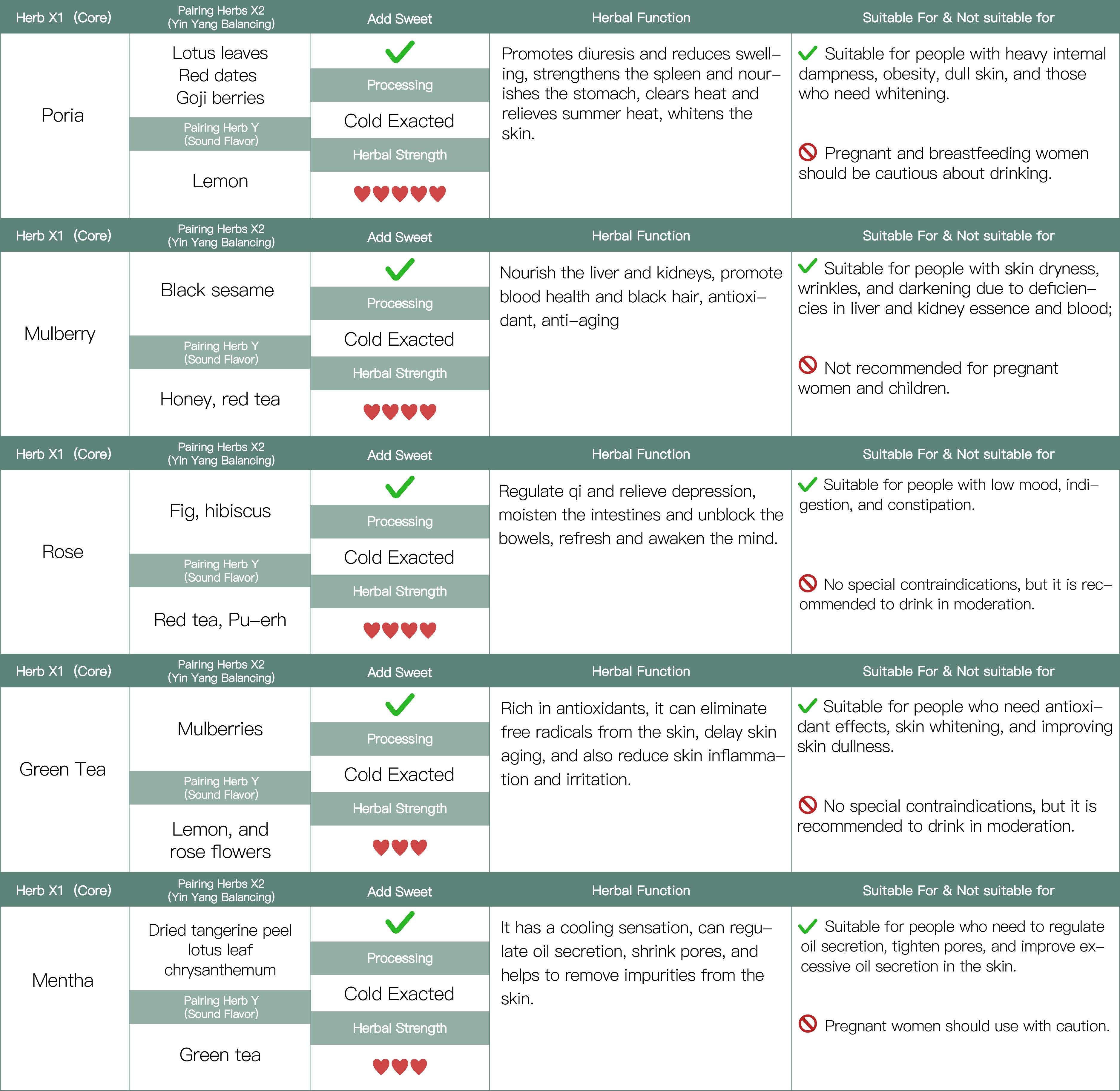 These ancient herbal formulas contain centuries of wisdom, showcasing not only the natural charm of herbal plants but also embodying the beauty concept of Traditional Chinese Medicine, which emphasizes nourishing the inside to beautify the outside.